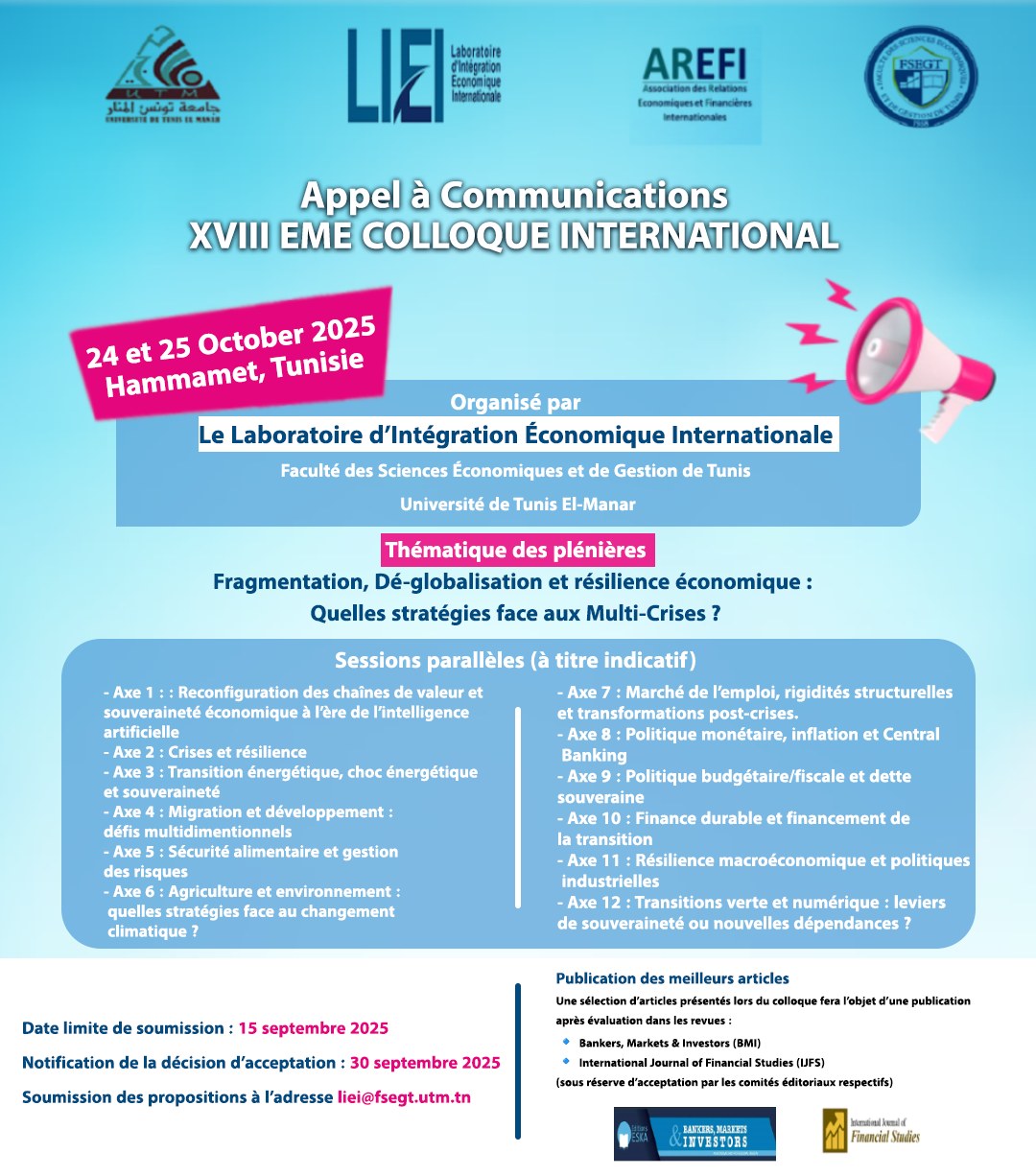 𝗔𝗽𝗽𝗲𝗹 à 𝗖𝗼𝗺𝗺𝘂𝗻𝗶𝗰𝗮𝘁𝗶𝗼𝗻 – XVIIIEME COLLOQUE INTERNATIONAL du Laboratoire d’Intégration Economique Internationale LIEI 𝟮𝟬𝟮𝟱 Le Colloque du Laboratoire d’Intégration Economique Internationale LIEI se tiendra les 24 et 25 Octobre 2025 à Hammamet. (Notez le changement de date)